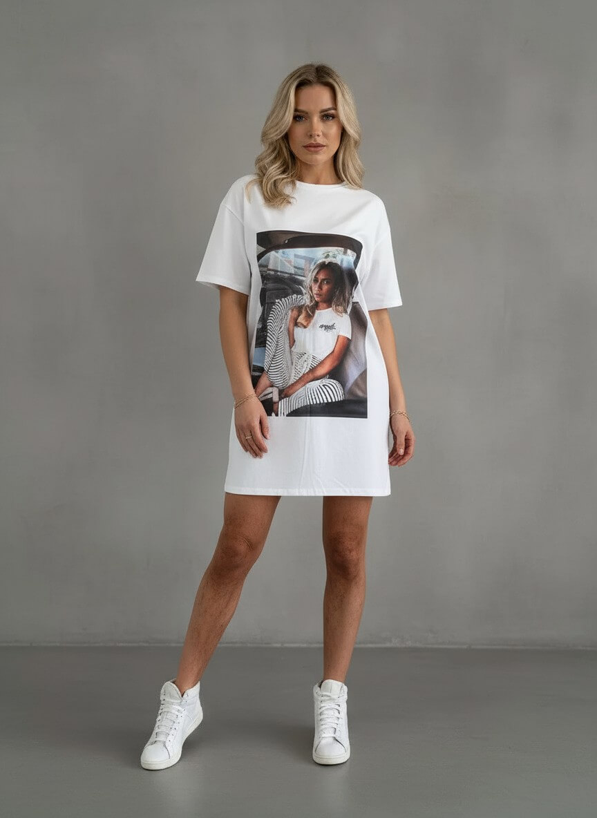 Ši suknelė išsiskiria moderniu ir šiuolaikišku dizainu. Ji sukurta taip, kad puikiai tiktų tiek kasdieniam dėvėjimui, tiek laisvalaikio išvykoms ar neįpareigojantiems susitikimams. Trumpų rankovių kirpimas suteikia laisvės judėti, o švelni baltos suknelės spalva pabrėžia moteriškumą ir lengvumą. Suknelės priekyje esanti subtili aplikacija tampa pagrindiniu akcentu – ji prideda išskirtinumo, stilingumo ir subtilaus žaismingumo.
