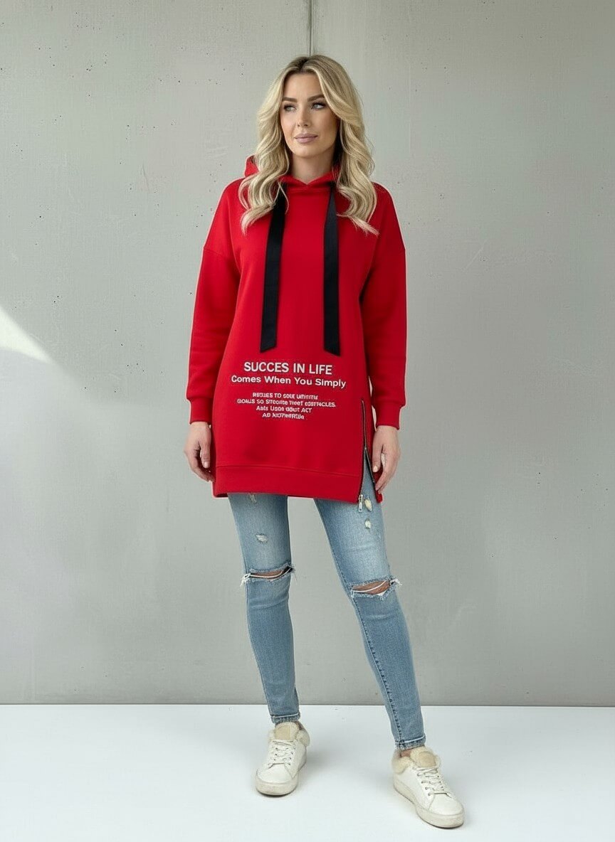 Raudonos spalvos džemperis su gobtuvu moterims – stilingoms damoms