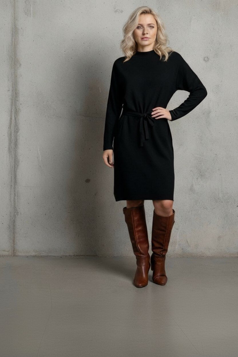 Juoda suknelė pasižymi tiesiu siluetu, prie liemens esantis raištelis leidžia priderinti suknelę prie individualių kūno linijų ir subtiliai pabrėžti figūrą. Midi ilgis – žemiau kelių – daro ją itin praktišką bei tinkamą įvairioms progoms. Ilgos rankovės suteikia jaukumo ir šilumos, todėl ši suknelė yra nepakeičiama rudens ir žiemos sezono metu.