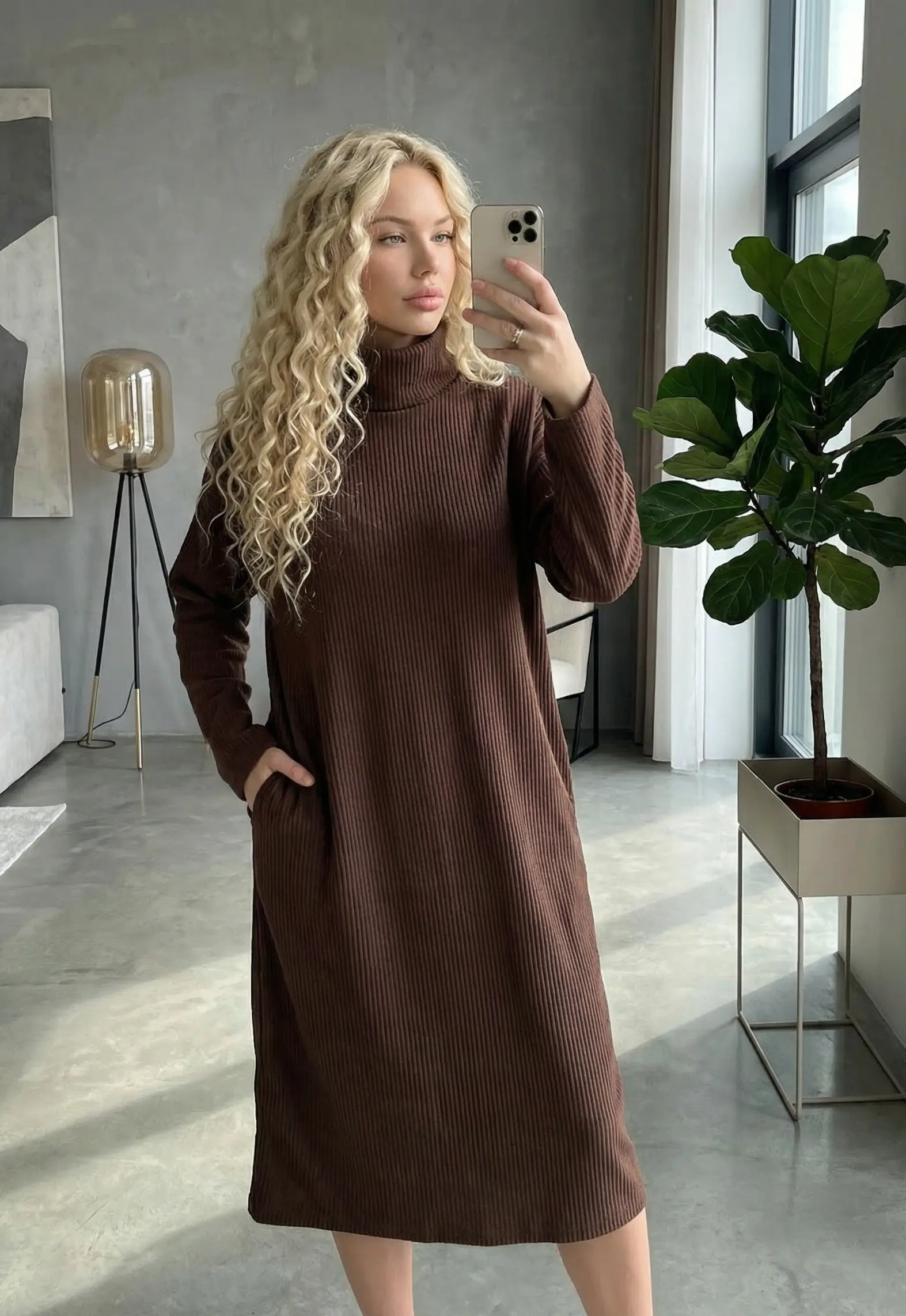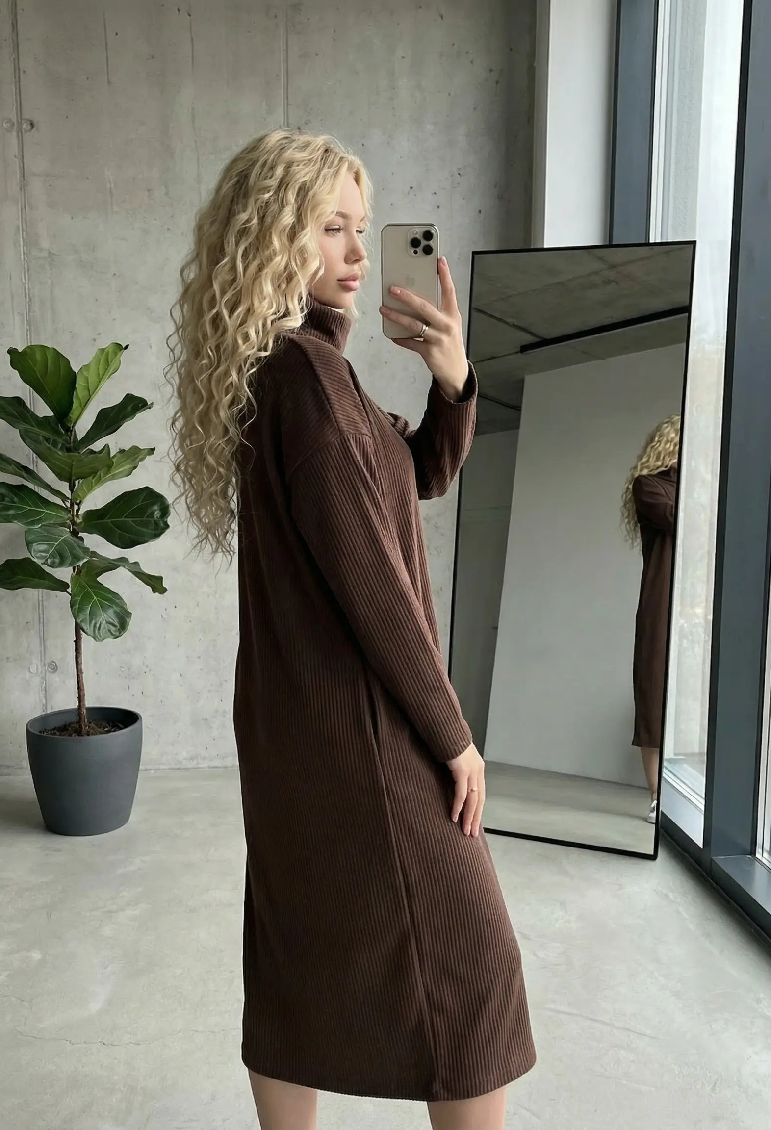 Ši suknelė – tai vienas geriausių pavyzdžių, ką reiškia madingos suknelės apkūnioms. Ji parodo, kad mada gali būti ne tik graži, bet ir patogi. Laisvas, bet proporcingas kirpimas leidžia paslėpti tai, ką norite, ir pabrėžti tai, ką mėgstate. Velvetinė tekstūra suteikia prabangos įspūdį, o ruda spalva išlieka neutrali – ją galima lengvai derinti prie skirtingų aksesuarų.