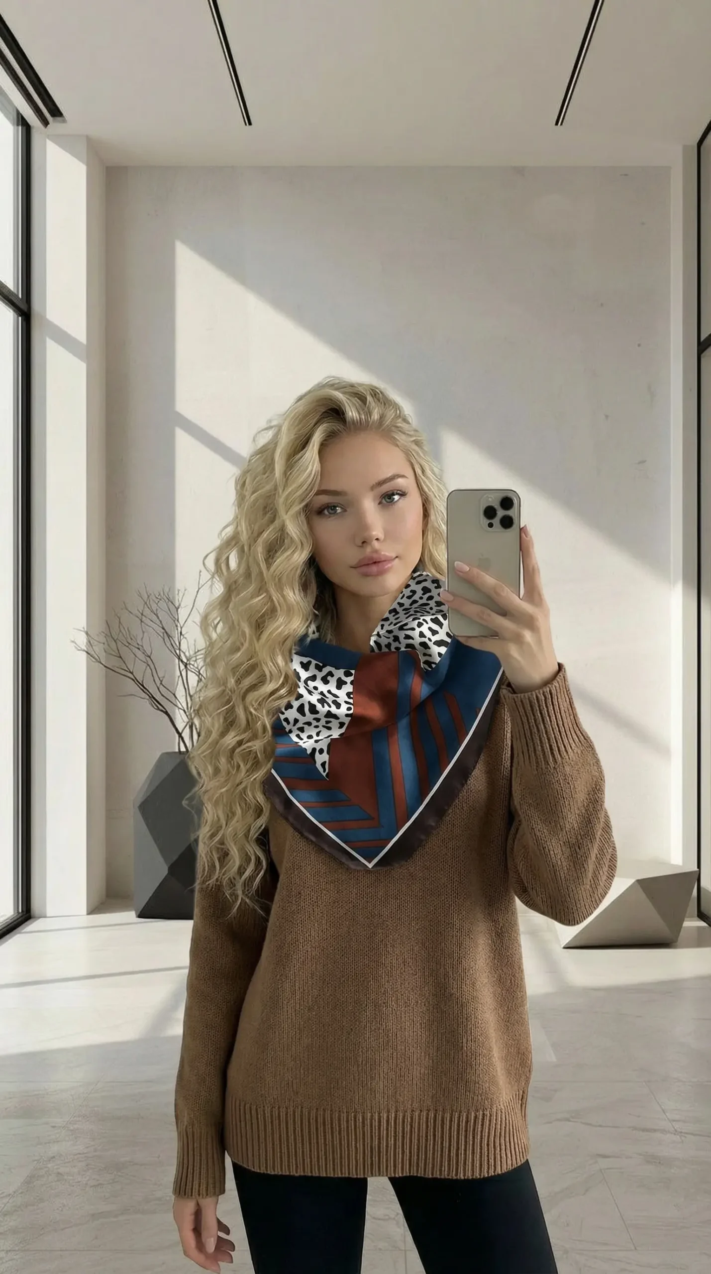 Ši elegantiška, šilką primenančio kritimo marga skarelė su rudų ir mėlynų atspalvių raštu – subtilus, tačiau išraiškingas aksesuaras, suteikiantis įvaizdžiui šilumos, jaukumo ir stiliaus. Ši skarelė ant kaklo puikiai tinka moterims, ieškančioms universalaus akcento, kuris subtiliai papildytų tiek kasdienį, tiek elegantiškesnį įvaizdį.