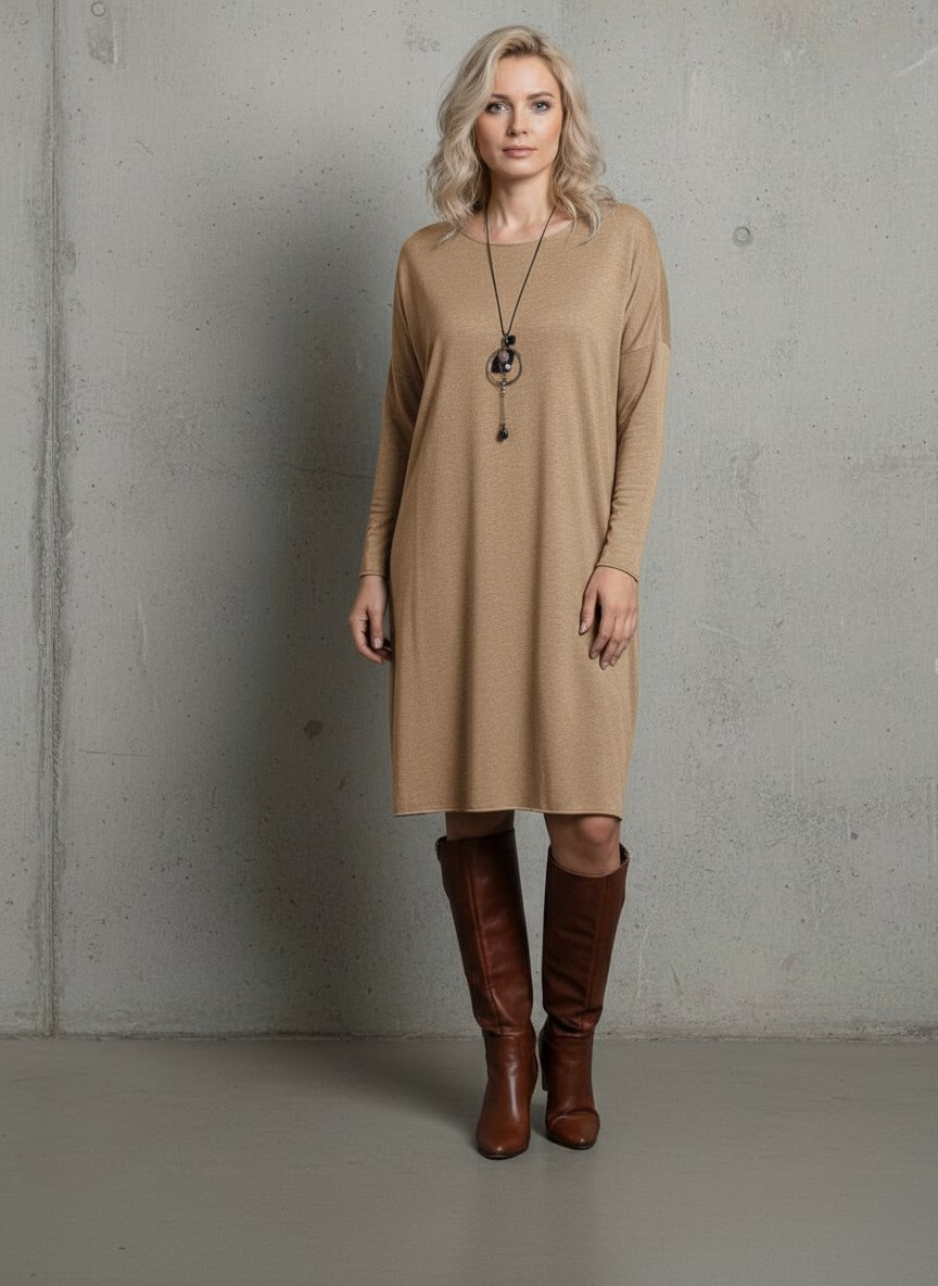 Stilinga ir žavi smėlio spalvos megzta suknelė ilgesnio modelio tinka visiems moterų figūrų tipams. Papildykite savo spintos turinį stilinga ir žavia smėlio spalvos suknele iš Stiliausradiniai.lt. Ši megzta suknelė pasižymi ilgiu iki kelių, kuris suteikia elegancijos ir rafinuotumo. Laisvai krentantis siluetas ne tik užtikrina patogumą, bet ir subtiliai pabrėžia figūrą, tinkantis bet kuriai moteriai. Smėlio spalva yra universali ir lengvai derinama su įvairiais aksesuarais, todėl suknelė taps nepakeičiamu jūsų garderobo akcentu. Papildomą žavesį suteikia prie suknelės esantis pakabukas, kuris prideda subtilų ir išskirtinį akcentą.