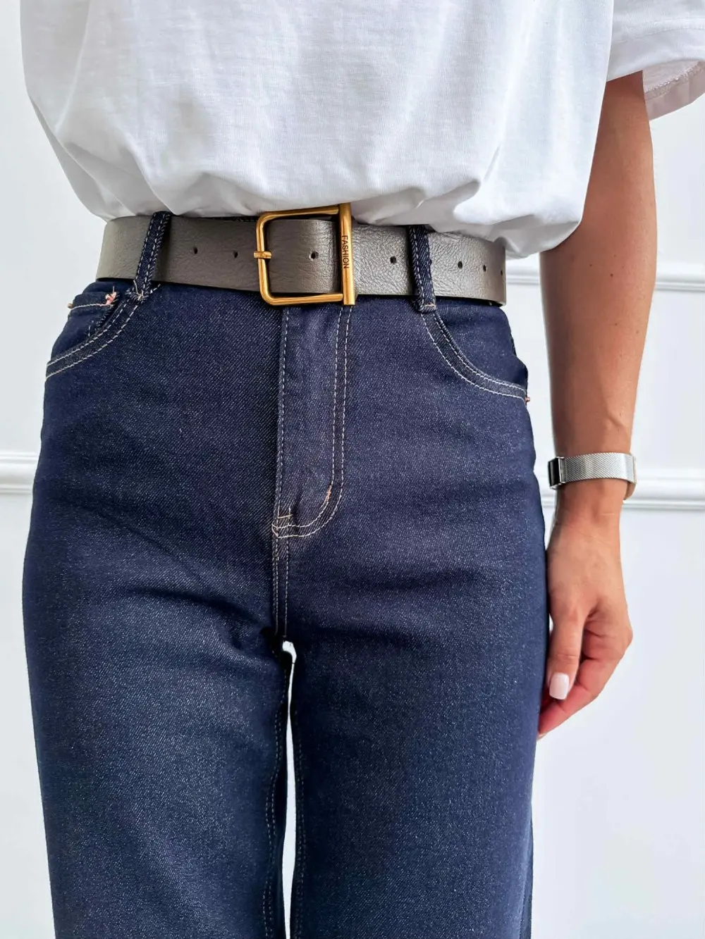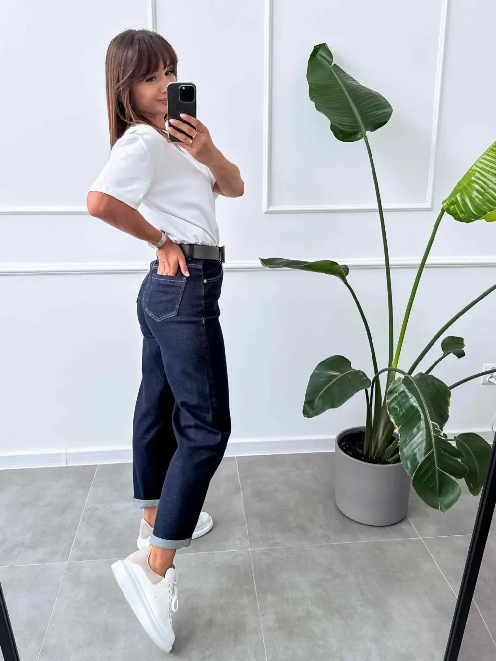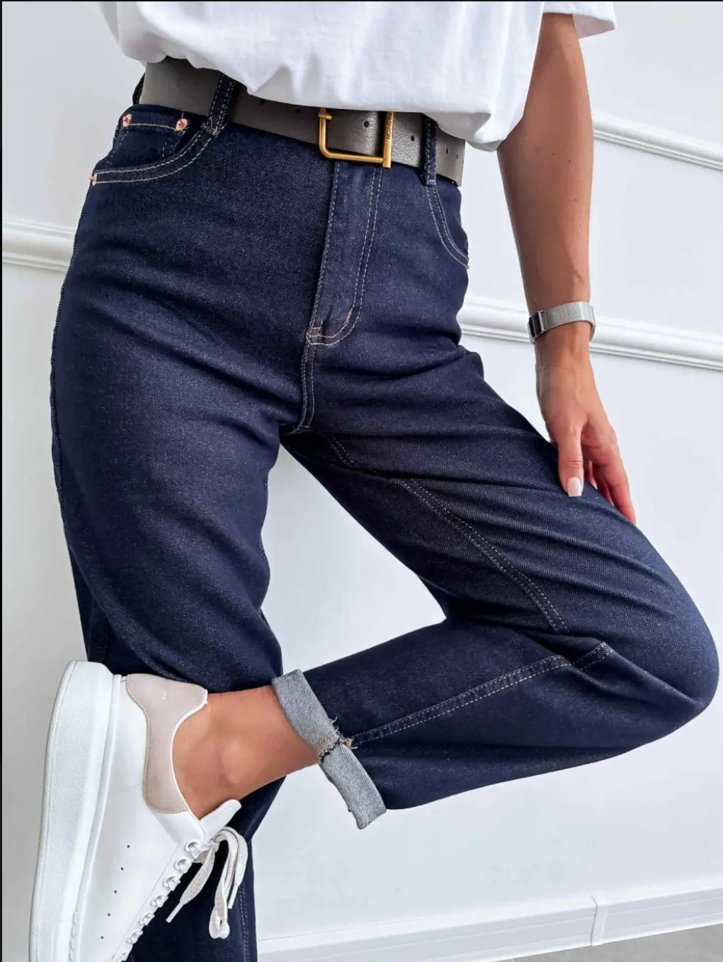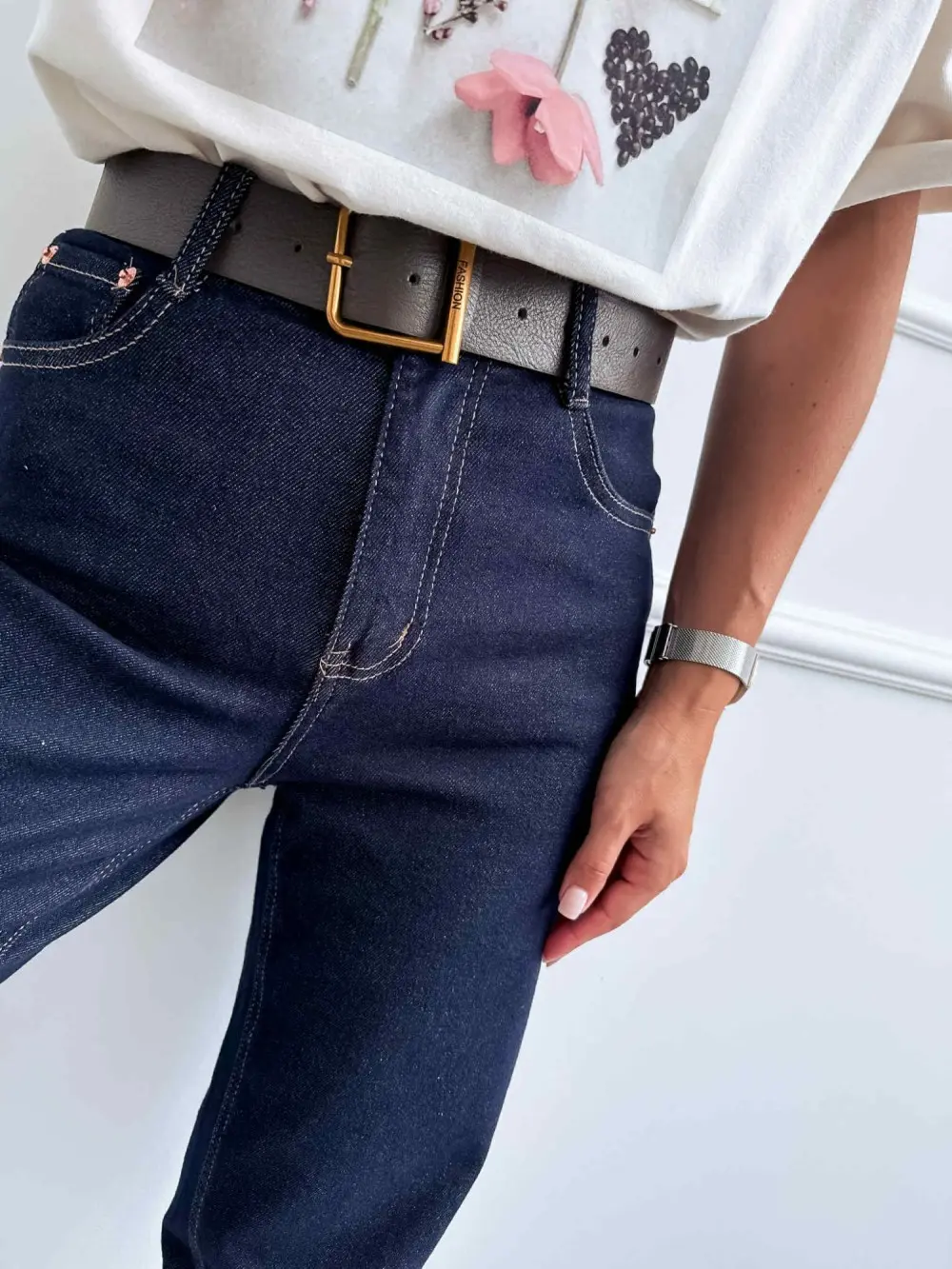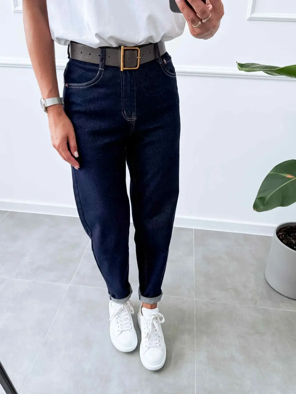 Papildykite savo įvaizdį stilingais diržais, kurie akcentuos aukštą liemenį, arba pasirinkite elegantiškus papuošalus, kad suteiktumėte džinsams papildomo žavesio. Tamsiai mėlyna spalva leidžia lengvai eksperimentuoti su įvairiomis spalvomis. Išbandykite su ryškiomis arba pastelėmis spalvomis, kad sukurtumėte unikalų ir asmenišką stilių. Šie moteriški džinsai yra universalūs ir puikiai tinka visiems sezonams. Prie džinsų nėra pridedamas diržas, tai tik parodytas stilingas akcentas, kuris suteikia dar daugiau išskirtinumo.