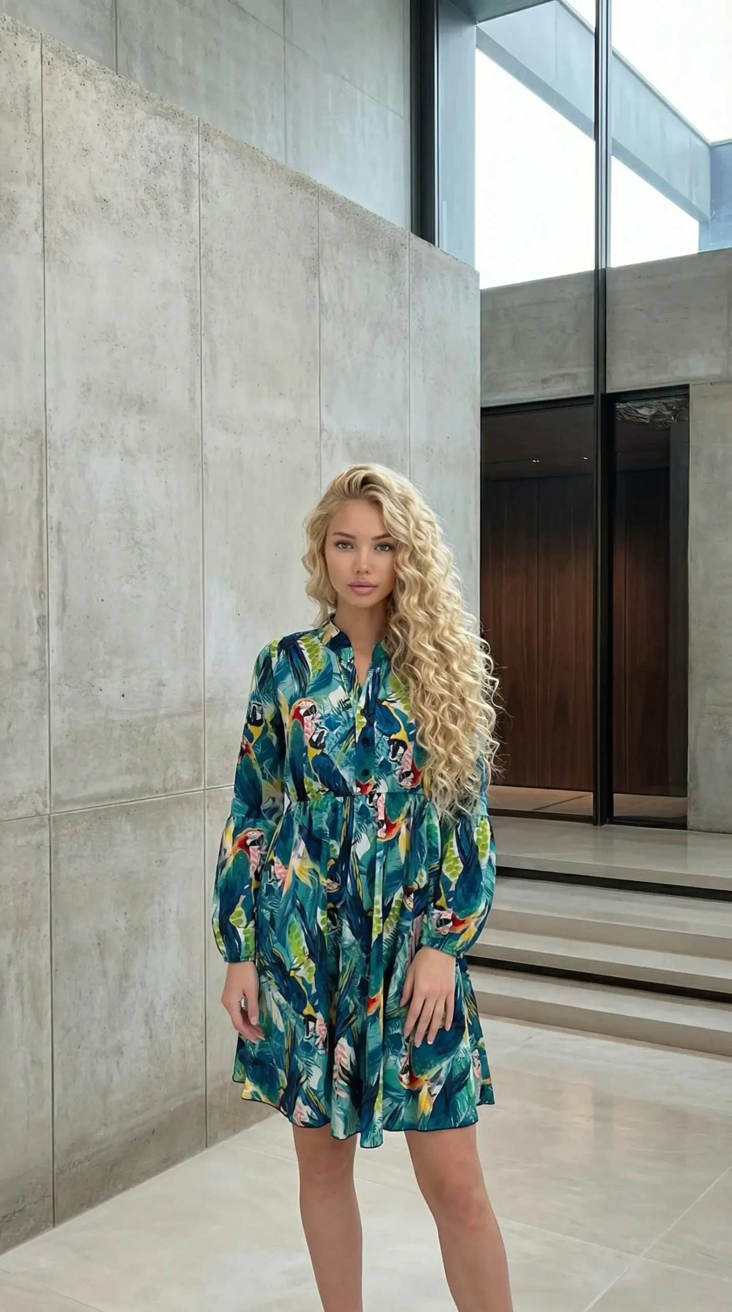 Moteriška suknelė, ieškančioms spalvingo, patogaus ir stilingo drabužio – tai margu tropinių raštų modelis su ilgomis rankovėmis, kuris traukia akį ir pabrėžia individualų stilių. Ši suknelė su sagutėmis priekyje išsiskiria egzotišku spalviniu sprendimu – ryškūs paukščiai, žali lapai ir kontrastingi tonai sukuria gyvą įvaizdį. Ji puikiai prisitaiko prie skirtingų figūros tipų.