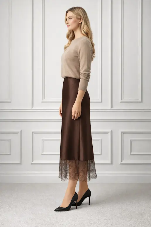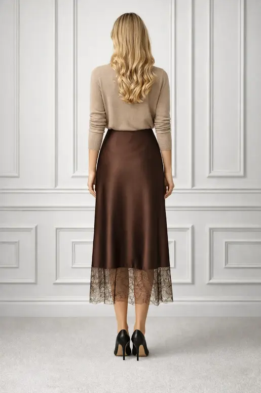 Satino sijonas yra universalus ir stilingas drabužis, puikiai tinkantis tiek kasdienai, tiek ypatingoms progoms. Ruda spalva suteikia klasikos, todėl jis lengvai derinamas su įvairiais drabužiais ir aksesuarais. Tamprus juosmuo su guma užtikrina patogumą ir leidžia sijonui priglusti prie kūno. Moteriškas satino sijonas išryškina moterišką siluetą, o tamprus juosmuo užtikrina, kad jis prisitaikytų prie jūsų liemens, kurio apimtis svyruoja nuo 66 iki 85 cm. Klubų apimtis nuo 90 iki 100 cm leidžia sijonui natūraliai priglusti, išryškinant kūno linijas.