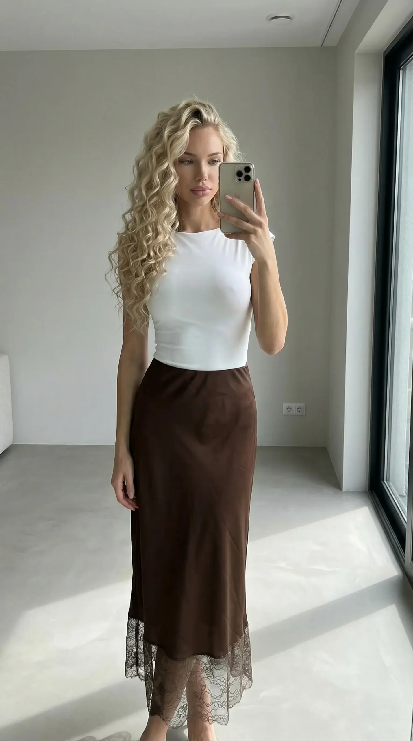 Rudas satino sijonas yra universalus drabužio elementas, leidžiantis kurti skirtingus derinius: