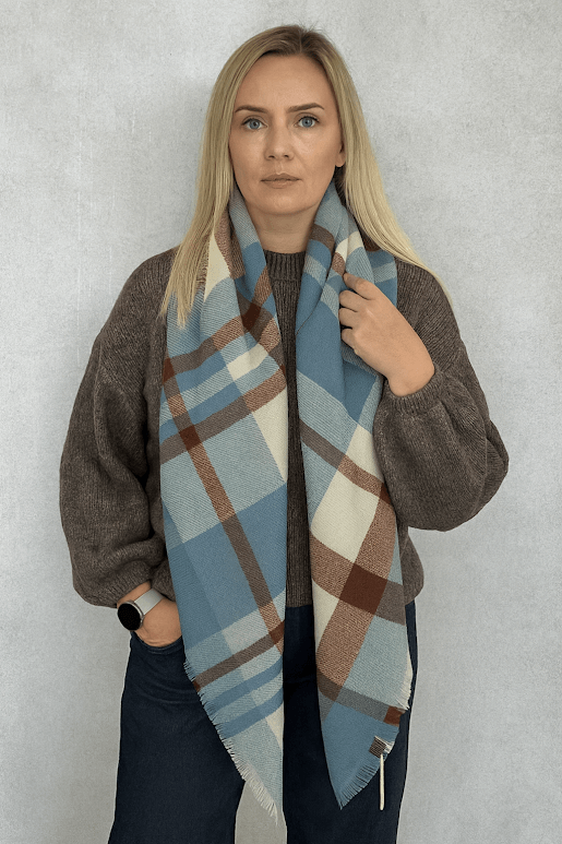 Mėlyna spalva su rudais atspalviais yra viena universaliausių, nes puikiai dera tiek su šviesiais, tiek su tamsiais drabužiais. Šis moteriškas šalikas papildys klasikinį vilnonio palto, elegantiško švarko ar net sportinės striukės įvaizdį. Neutralus atspalvis leidžia šaliku puoštis įvairiomis progomis – tiek kasdien, tiek einant į darbą ar ypatingą renginį.