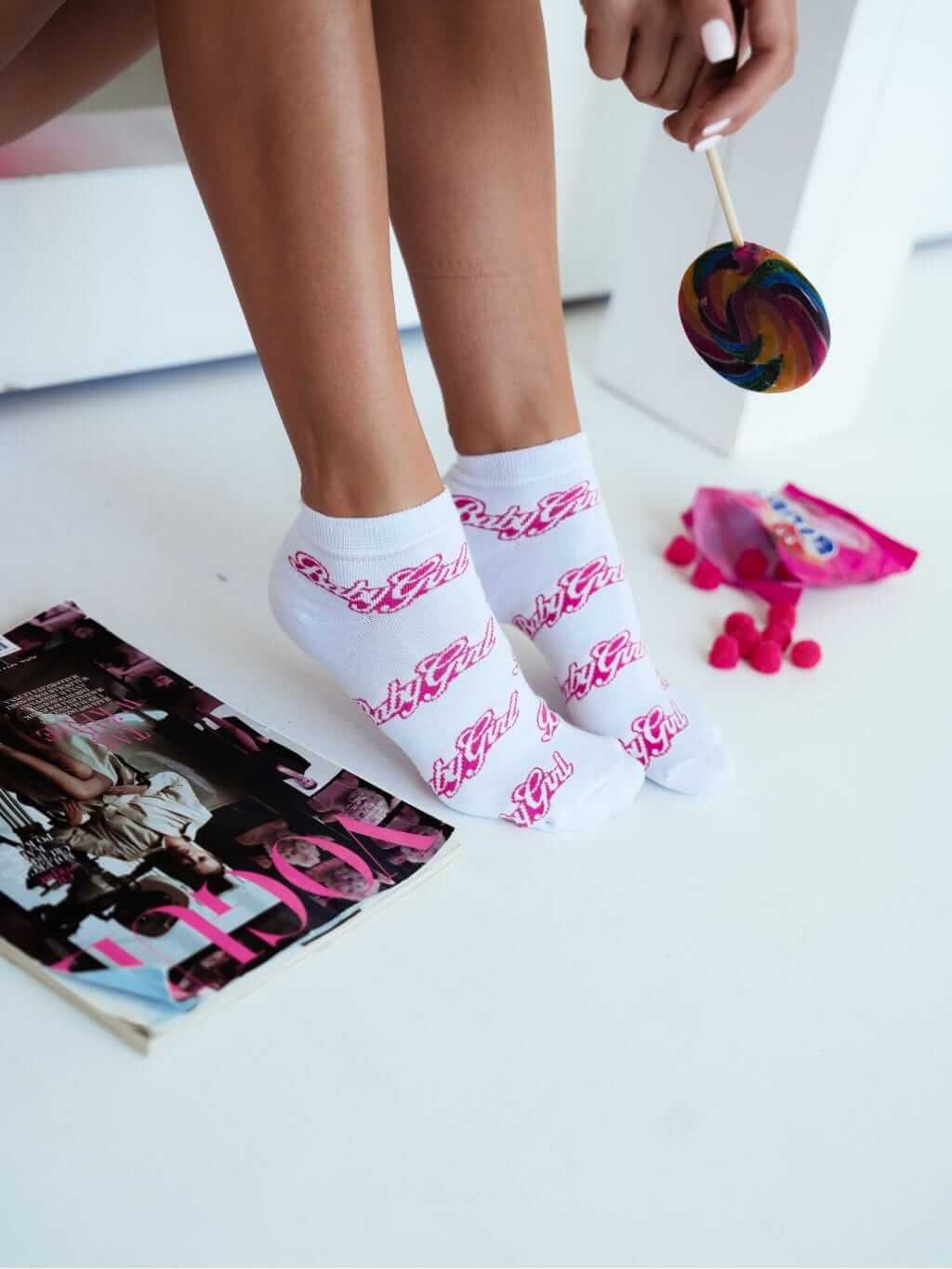 Kojinės dekoruotos išskirtiniu užrašu BABY GIRL , kuris suteikia subtilų moteriškumą ir stilingumą. Subtilus užrašas ne tik puošia, bet ir priduoda šiek tiek išskirtinumo, negu paprastos kojinės. Užrašas išilgai kojinės sukuria vizualinį akcentą, kuris traukia dėmesį ir suteikia kontrasto baltam fonui. Šis dizainas yra subtilus, bet tuo pačiu modernus, leidžiantis lengvai derinti kojines prie įvairių aprangos stilių – nuo laisvalaikio iki sportinio stiliaus aprangos.