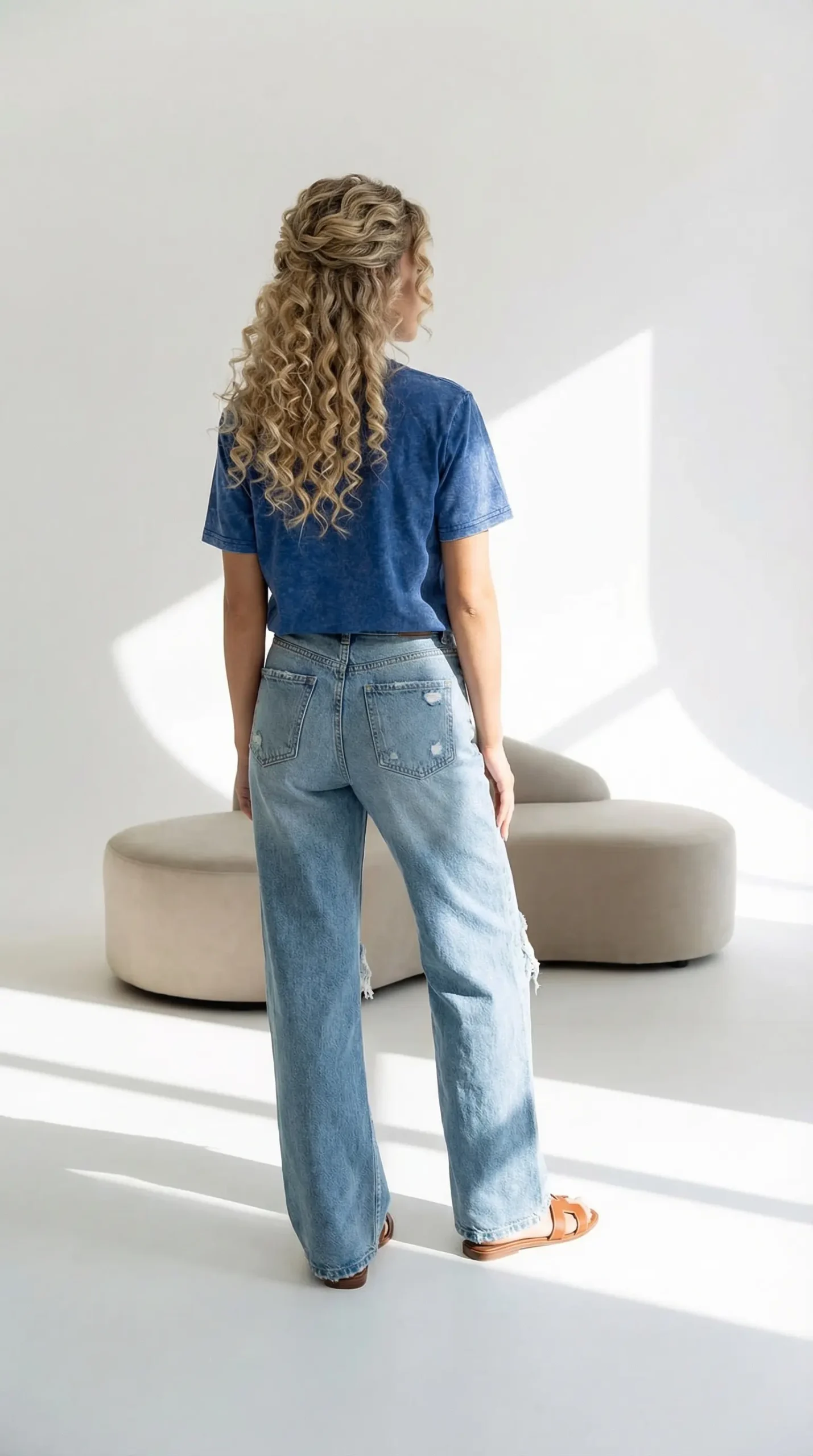Nuotraukoje matote tobulą derinį – maikutė trumpomis rankovėmis puikiai dera su mėlynais plėšytais džinsais ir rudomis šlepetėmis. Taip pat galite derinti: