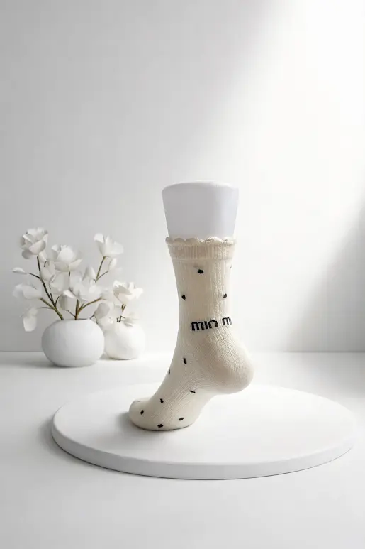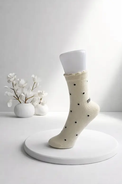Kojinės dekoruotos elegantišku medvilnės raštu, kuris suteikia subtilų moteriškumą ir stilingumą. Medvilnės raštas ne tik puošia, bet ir priduoda šiek tiek papildomo lengvumo bei oro cirkuliacijos, tad kojos kvėpuoja net ir ilgesnį laiką jas dėvint. Papildoma juodos spalvos dekoracija taškeliai sukuria vizualinį akcentą, kuris traukia dėmesį ir suteikia kontrasto. Šis dizainas yra subtilus, bet tuo pačiu modernus, leidžiantis lengvai derinti kojines prie įvairių aprangos stilių – nuo laisvalaikio iki biuro aprangos.
