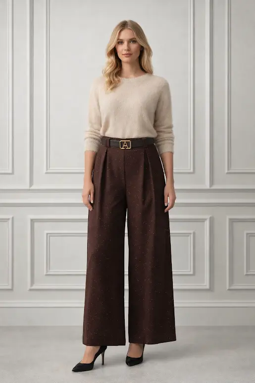- Plačios kelnės: Stilingas, laisvas siluetas, kuris suteikia elegancijos ir komforto, leisdamas jaustis laisvai visą dieną.