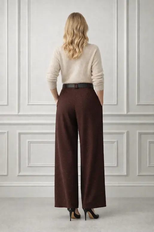 Šios plačios kelnės – tai stilingas ir patogus pasirinkimas, tinkantis tiek kasdienai, tiek ypatingoms progoms. Ruda spalva, minkšta medžiaga ir aukštas tamprus liemuo paverčia jas nepakeičiamu drabužiu Jūsų spintoje. Minkšta, lengvai krentanti medžiaga užtikrina, kad šios plačios kelnės bus patogios dėvėti bet kuriuo metų laiku.