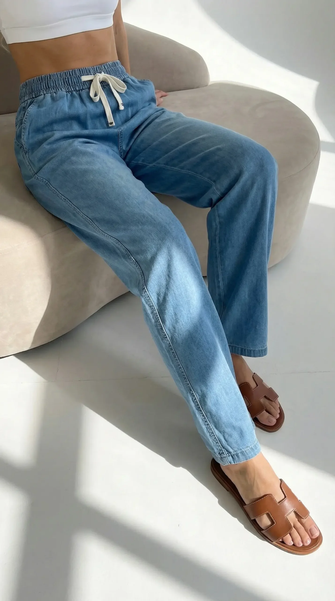 Avalynės pasirinkimas — taip pat labai platus. Lengvos šlepetės ar sandalai sukurs nerūpestingą vasaros įvaizdį, o sportiniai laisvalaikio bateliai pridės žaismingumo ir energijos. Abu variantai puikiai dera prie plačių džinsų silueto ir pabrėžia natūralų audinio kritimą.