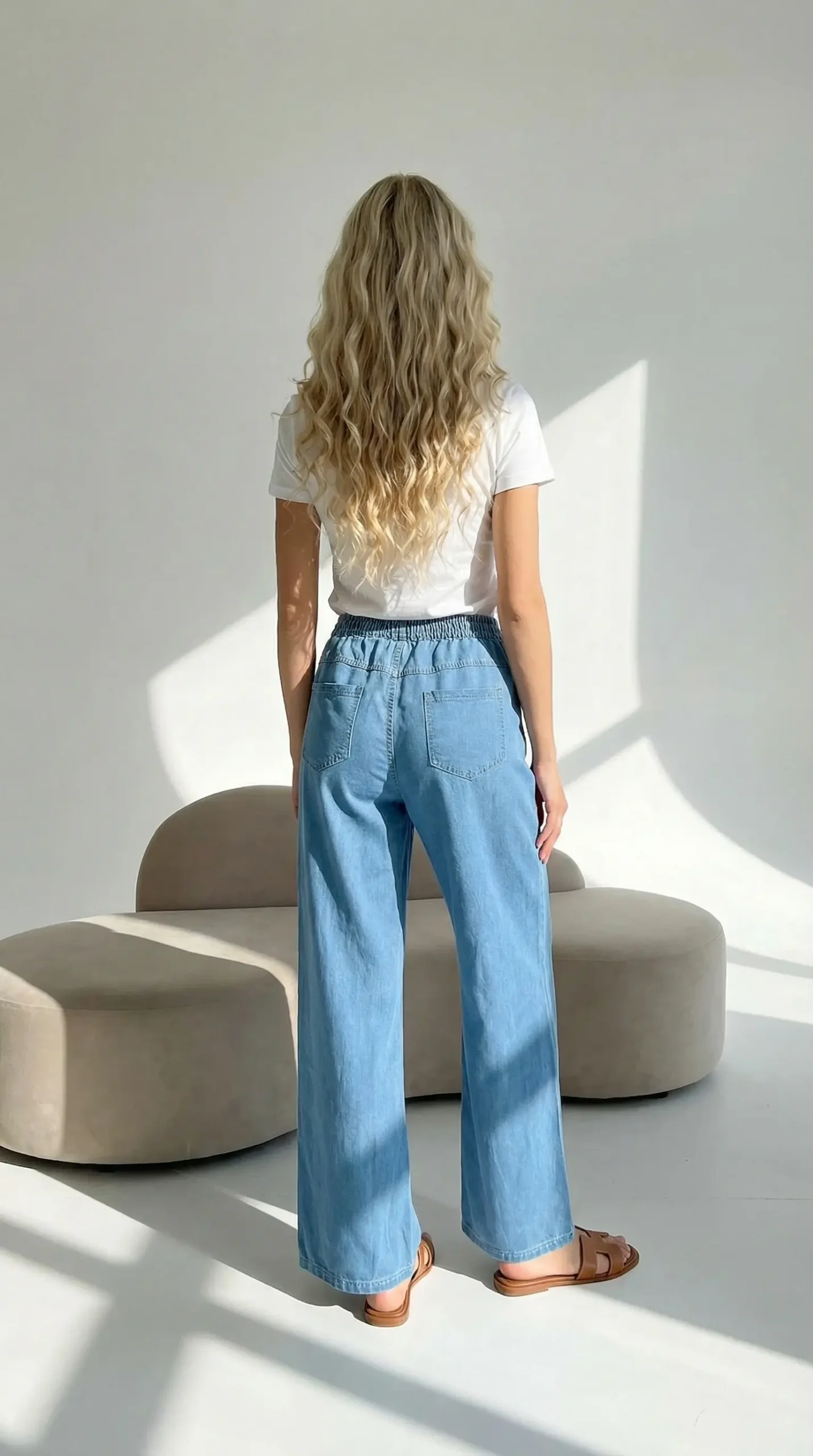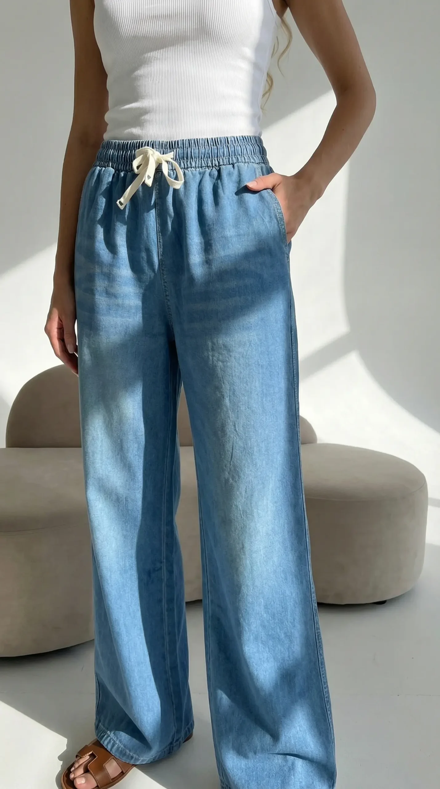 Platūs džinsai moterims — tai tobulas pasirinkimas toms, kurios ieško patogių, bet stilingų kelnių kasdienai, išeigai ir laisvalaikio akimirkoms. Švelnūs, orūs ir lengvai krentantys — jie taps mylimiausiu jūsų vasaros drabužiu. Šių plačių džinsų  kirpimas sukurtas taip, kad audinys natūraliai ir laisvai kristų palei kūno linijas. Jokio spaudimo, jokio diskomforto — tik malonus lengvumas, kurį jaučiate visą dieną. Plačios klešnys, kojai suteikia elegantiško, bet kartu atpalaiduojančio stiliaus įspūdį.