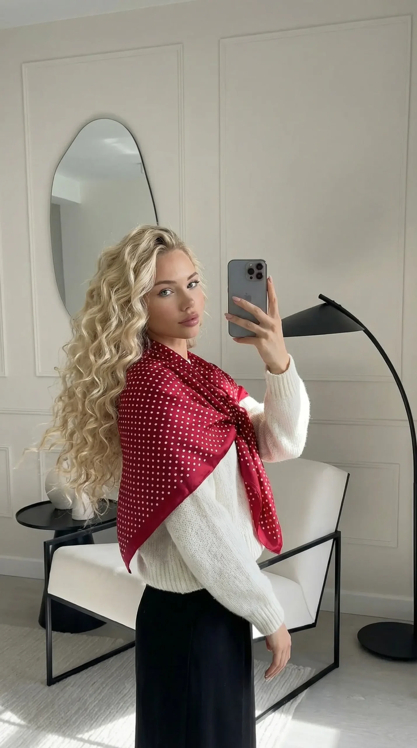 Ši stilinga it šilkas skarelė ant kaklo su bordo spalvos raštu yra idealus pasirinkimas kiekvienai moteriai, norinčiai pridėti šiek tiek žavesio ir rafinuotumo prie savo aprangos. Skarelės dizainas gili bordo spalva su baltais taškeliais, sukuria džiaugsmingą ir energingą atmosferą, kuri neabejotinai pritrauks aplinkinių dėmesį. Raštas:klasikiniai taškeliai moderniai interpretuoti – atrodo tvarkingai, bet ne nuobodžiai. Kiekviena spalva harmoningai derinama tarpusavyje, leidžianti jums išsiskirti iš minios ir pabrėžti savo individualumą bei išskirtinį stilių.