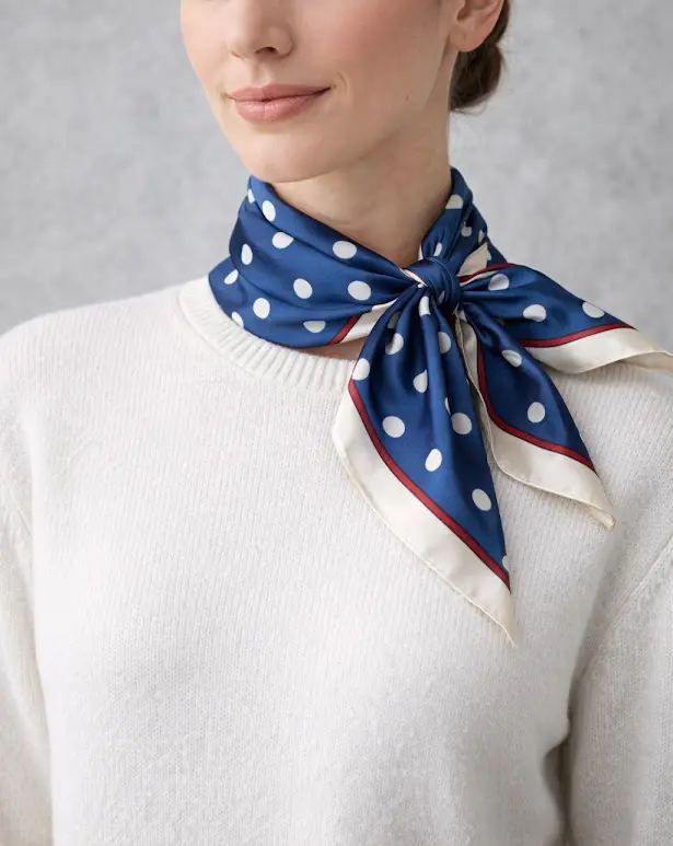 Ši stilinga it šilkas skarelė ant kaklo su mėlynos spalvos raštu yra idealus pasirinkimas kiekvienai moteriai, norinčiai pridėti šiek tiek žavesio ir rafinuotumo prie savo aprangos. Skarelės dizainas gili mėlyna spalva su kreminiais taškeliais, sukuria džiaugsmingą ir energingą atmosferą, kuri neabejotinai pritrauks aplinkinių dėmesį. Raštas:klasikiniai taškeliai moderniai interpretuoti – atrodo tvarkingai, bet ne nuobodžiai. Kiekviena spalva harmoningai derinama tarpusavyje, leidžianti jums išsiskirti iš minios ir pabrėžti savo individualumą bei išskirtinį stilių.